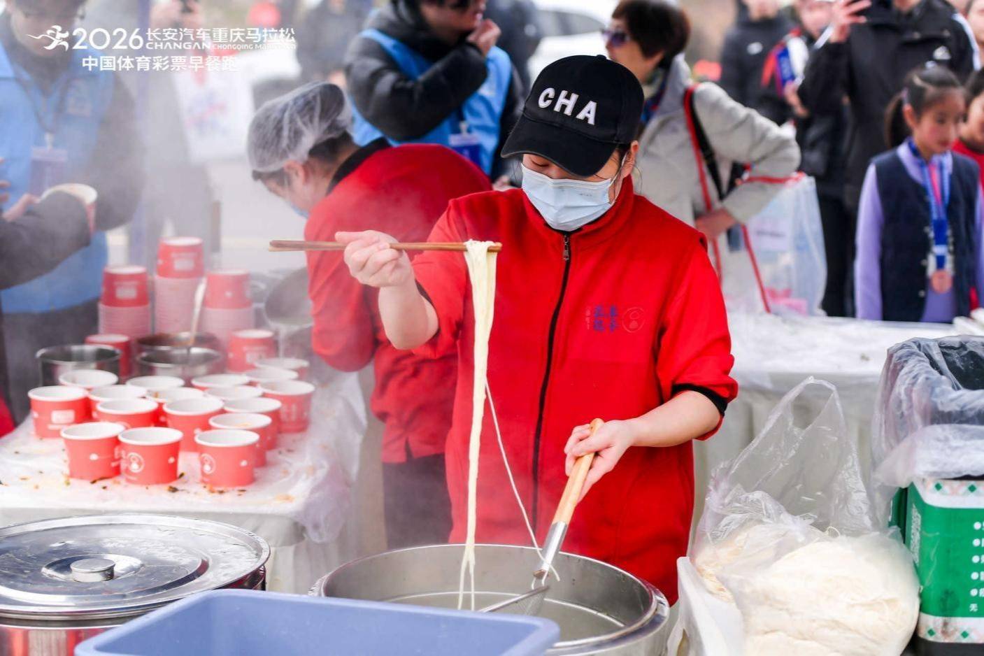 冲过止境线后,热气腾腾的渝味早餐区人气新生,特点肉包、老面馒头、重庆小面等本土美食,既驱散了晨跑的微寒,更让跑友们品尝到重庆的烟火温情。